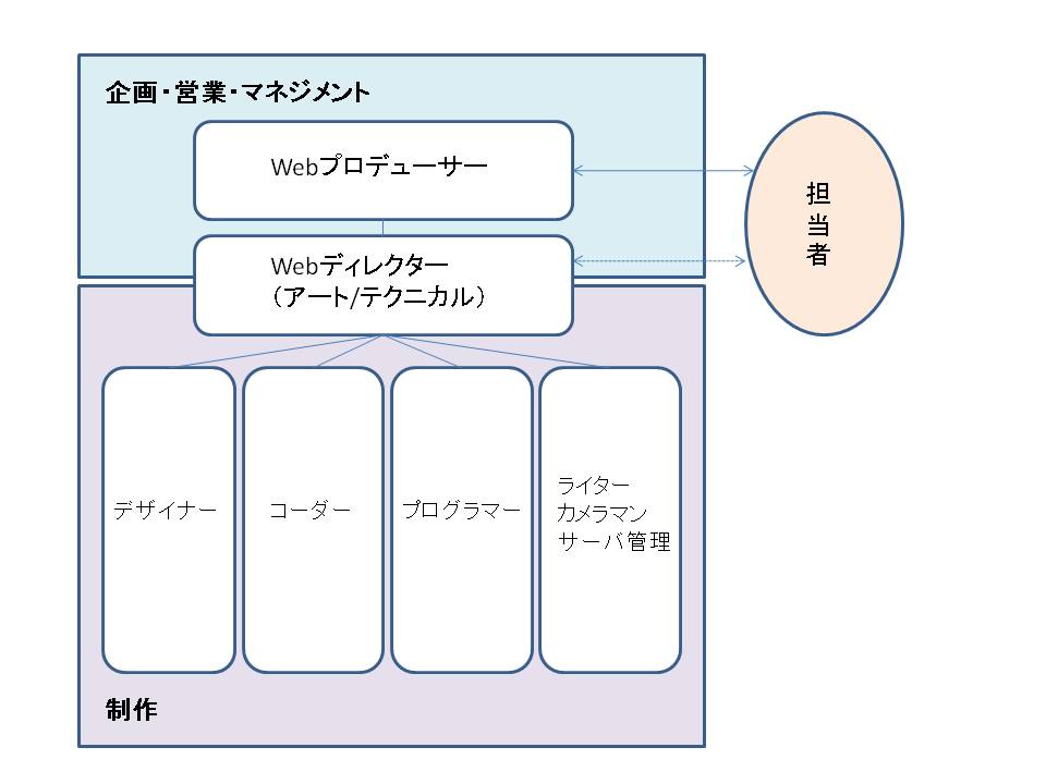 Web制作請負会社の場合、先方の担当者と直接話し合ってサイト構築の企画を立てる「Webプロデューサー」、Webプロデューサーや場合によっては先方の担当者と話し合いながらWebサイト全体の設計を行う「Webディレクター」、Webディレクターのもとで実際にサイト制作を行う「デザイナー」「コーダー」「プログラマー」「ライター/カメラマン/サーバ管理者」がいる。