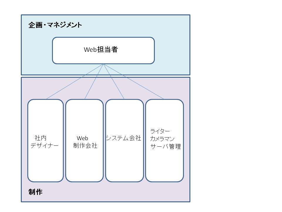 自社サイト制作の場合、チーム構成例としては「Web担当者」の下に、制作者として「社内デザイナー」「Web制作会社」「システム会社」「ライター/カメラマン/サーバ管理者」などが置かれる場合が多い。先ほどの請負会社の例と違い、外注(アウトソーシング)が行われる場合が多いのが特徴である。この場合の制作フェーズとしては、「分析・調査」→「プランニング」→「社内プレゼン」→「制作」→「リリース」→「運用/効果測定」となる。