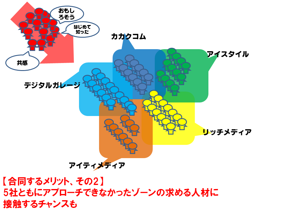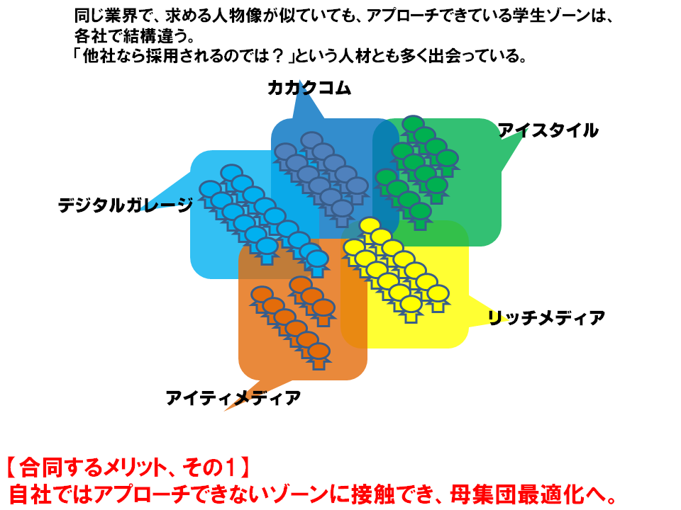 各社が合同しようと考えた時、それぞれの得意・不得意を補完しあうことで、各社の母集団の適正化やターゲット修正が施されるであろうことが、大きなメリットだと考えました。